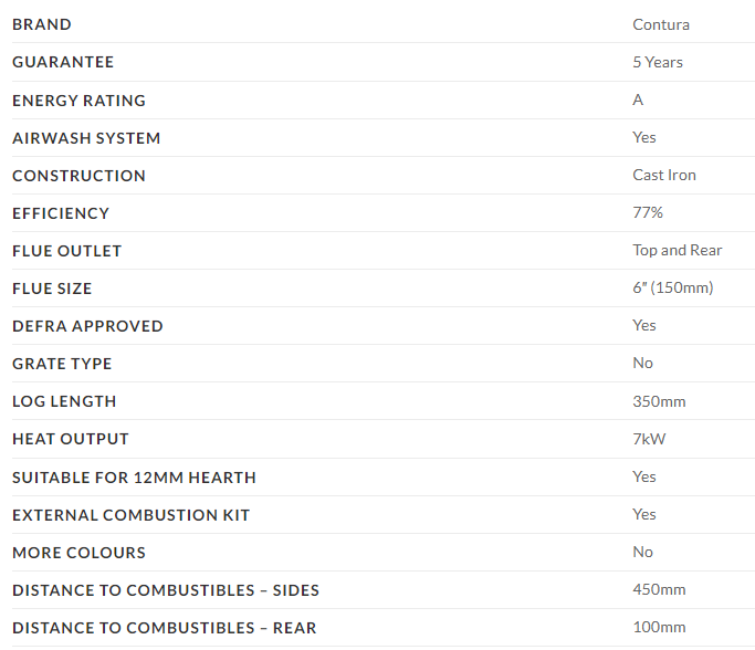 | Manufacturers Warranty - Parts | 5 Years on stove body (extendable to 10 years on registering appliance with Contura) |