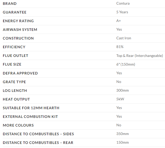 | Manufacturers Warranty - Parts | 5 Years on stove body (extendable to 10 years on registering appliance with Contura) |