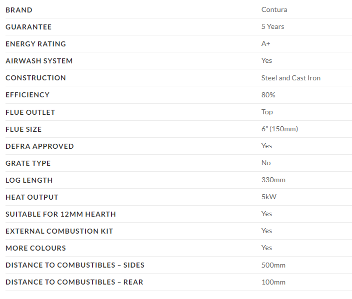 | Manufacturers Warranty - Parts | 5 Years on stove body (extendable to 10 years on registering appliance with Contura) |