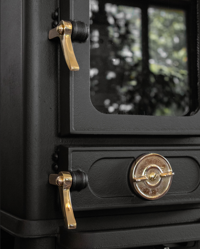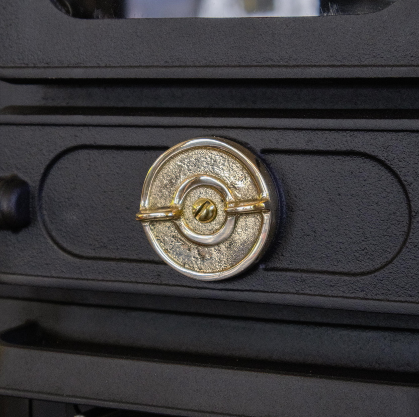 The Hobbit stove comes standard with chrome fittings, but you can also opt for solid brass fittings for your small wood-burning stove. Choosing brass fittings will give your stove a more traditional look, replacing the door pins, airflow wheel pin, riddling arm, and door handles of your Hobbit stove.