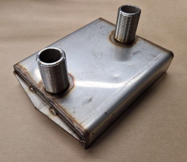 The Hobbit can be equipped with a side boiler, allowing you to generate a hot water supply for your house, vehicle, or tiny home! The side boiler fits neatly inside the stove's firebox. This unit transfers 1kW of heat from the stove, measures 155mm x 43mm (92mm including lugs) x 210mm high and has a capacity of 0.92 litres of water.