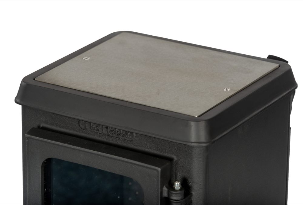 Dramatically enhances the cooking potential of your Hobbit stove by expanding the stovetop, providing more space for kettles and other cookware. This option is easily removable, allowing you to quickly take it on and off your small wood-burning stove. To use this feature, you will need to exit from the back of the appliance using the rear flue wedge. Dimensions are approximately 50cm long, 27.5cm wide, and 2.5cm deep.